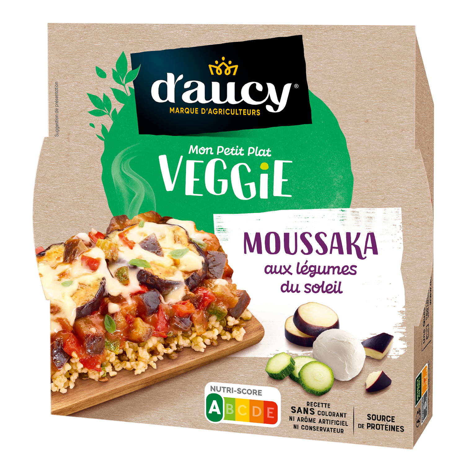 Boulgour précuit (blé dur précuit concassé), aubergines 20 %, pulpe de tomates au jus 13% (tomates, jus de tomates), lentilles précuites, courgettes 4,5 %, mozzarella 3 % (lait de vache pasteurisé, sel, ferments lactiques [dont lait], coagulant microbien, amidon), poivrons rouges, oignons, crème, huile d’olive vierge, amidon, ail, basilic, sel, miel, épices, thym.